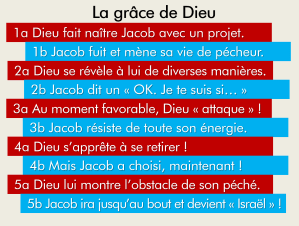 Jubilatoire, non ? Tout y est : l’appel de Dieu, son action dans le cœur du pécheur, la réponse du pécheur. C’est vrai que Jacob n’aurait pas été capable de se convertir à Dieu à Béthel, lors de la vision de l’échelle. Il était encore bien trop imbu de lui-même. Mais, un élément qu’on oublie souvent, Dieu travaille inlassablement dans nos cœurs rebelles, et pour cela, il a besoin du facteur… temps ! Pour Jacob, au torrent de Jabbok, c’était le temps de Dieu.