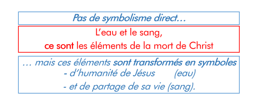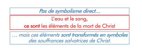 Remarquez d’ailleurs que l’eau précède le sang, et non l’inverse ! Et ce serait curieux d’associer un symbole et une réalité. Cette même remarque vaut pour l’interprétation suivante.